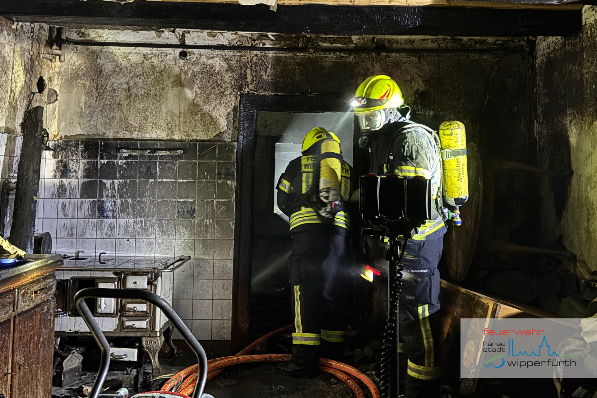 Im weiteren Einsatzverlauf lag der Schwerpunkt zunächst auf der Außenbrandbekämpfung, anschließend folgte die Brandbekämpfung im Gebäude. Hierbei waren mehrere Trupps unter umluftunabhängigem Atemschutz im Einsatz.